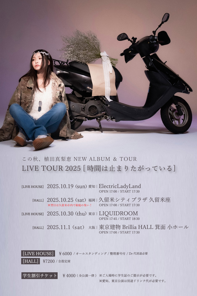 LIVE TOUR 2025 [時間は止まりたがっている] SCHEDULE 2025/10/30(木) 18:30 - 20:30 LIQUIDROOM OPEN 17:45 / START 18:30 (問) Production Makee MORE INFORMATION URLをコピーする 報告する